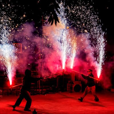 Llegando a contar con hasta seis personas en escena, FOC combina el teatro de calle, la danza y la pirotecnia para contar todas estas situaciones nomencladas según el libro oracular chino “I Ching”.